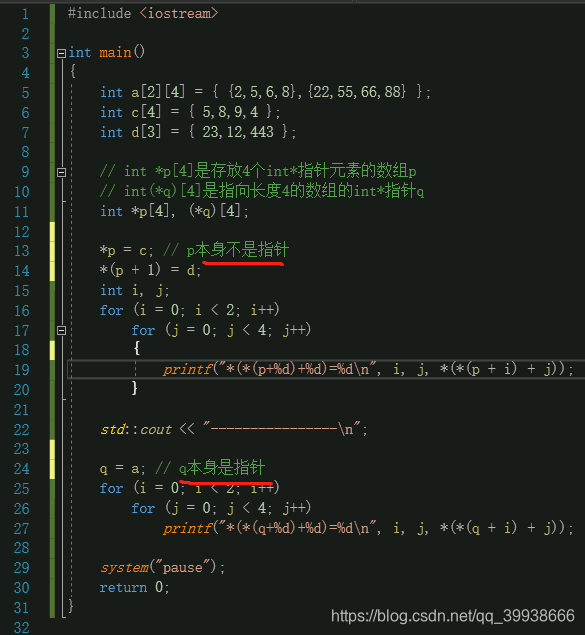 int (*q)[4],首先是个指针,即*q,剩下的“int [4]”作为补充说明,即说明int (*q)[4]是指向长度为4的数组的int*指针q。